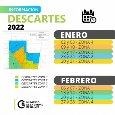 El siguiente cronograma estipula los días en que deben sacarse los descartes. Solicitamos a los vecinos y vecinas sacar los descartes a la vía pública antes del lunes al medio día. Los mismos serán recolectados en el transcurso de la semana.
