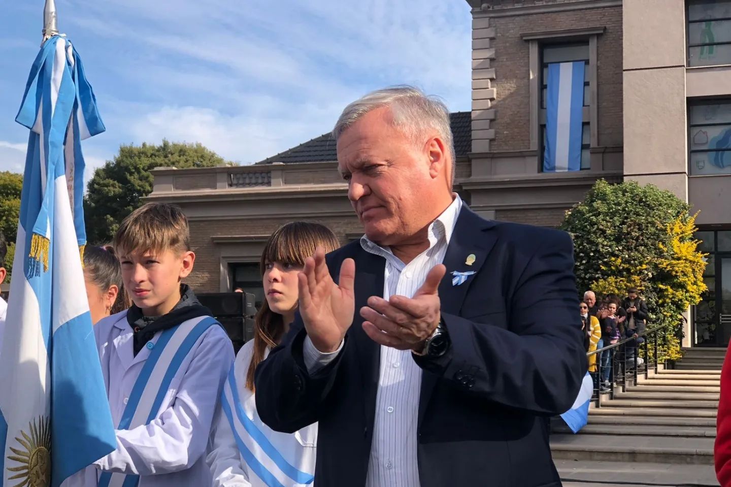 En rueda de prensa, dijo "Este año acompañado de los Ex - Combatientes de Malvinas, a 40 años de aquella gesta histórica...Lo viví con la emoción de siempre, ver la alegría de los chicos es muy reconfortante" agregó "Y más aún viendo una obra de teatro con alumnos de nuestro liceo, donde simbolizó la creación de nuestra bandera, la verdad es muy emocionante". Finalizó.