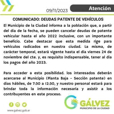 El Municipio de la Ciudad informa a la población que, a partir del dia de la fecha, se pueden cancelar deudas de patente vehicular hasta el año 2022 inclusive, con un importante beneficio. Cabe destacar que esta medida rige para vehículos radicados en nuestra ciudad. La misma, de carácter temporal, estará vigente hasta el día viernes 24 de noviembre del cte. y, es requisito indispensable, tener al día los pagos del año 2023.